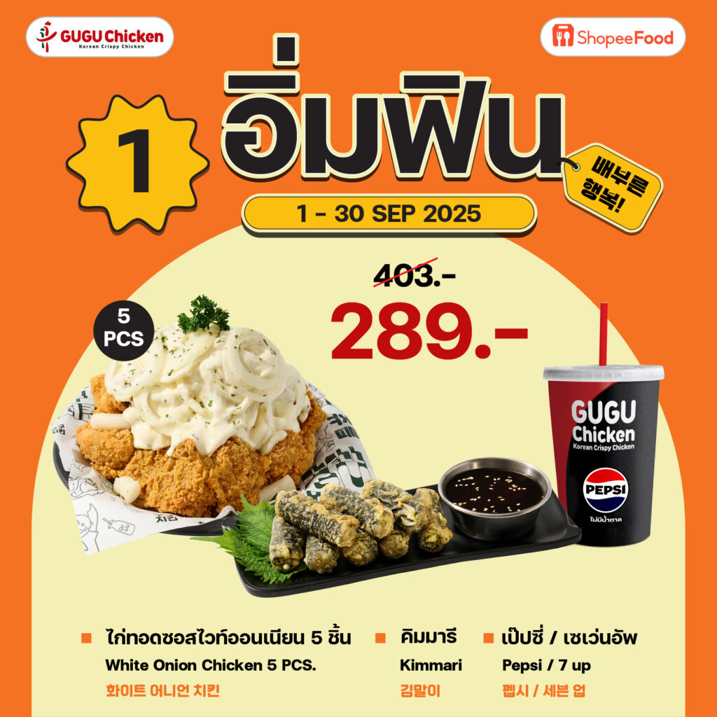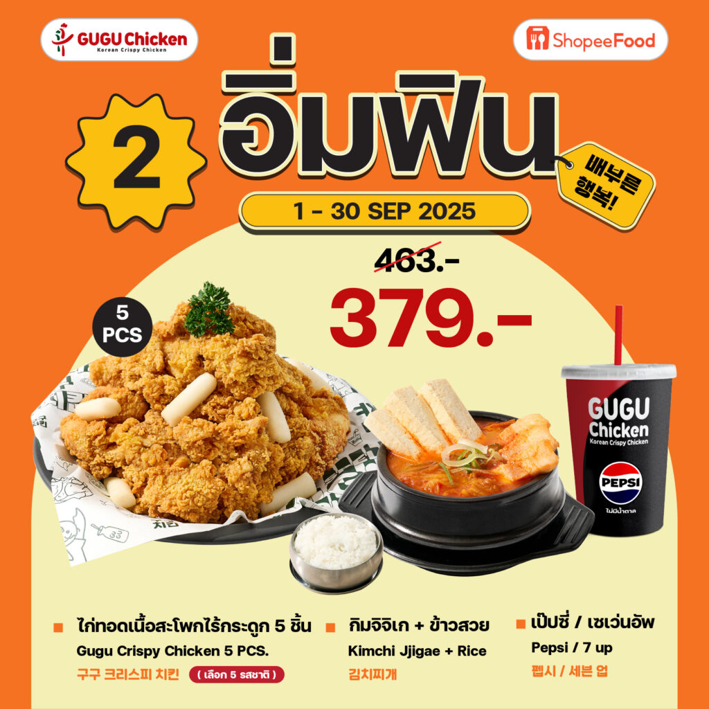 🧡 Happy Set 2: 5 pcs GUGU Crispy Chicken (choose your Flavor: Crispy, Caramel, Yangnyeom, White Onion, or The Maewun) + Kimchi Jjigae + Steamed Rice + Pepsi or 7Up → only 379.- (regular 463.-)